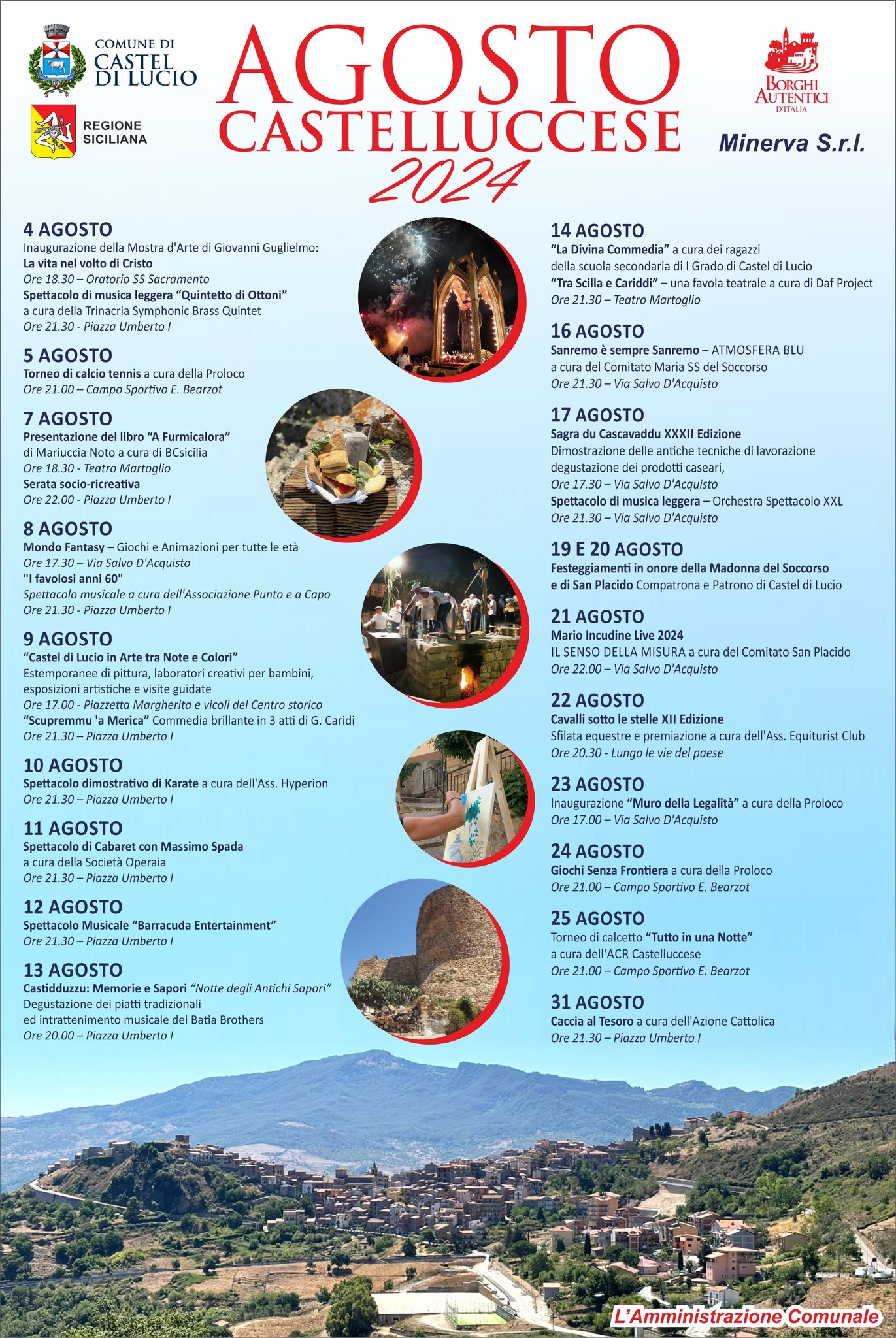 Tra gli eventi più interessanti segnaliamo Mariuccia Noto, scrittrice di origini mottesi, che si affaccia al mondo della lettura con l'appassionante romanzo A furmicalora, presentato a Castel di Lucio giorno 7, lo spettacolo di cabaret con Massimo Spata, attore, cabarettista, barzellettiere di origini ragusane (11) e Castel di Lucio in Arte tra note e colori, una bella kermesse con laboratori creativi per bambini, visite guidate ed esposizioni artistiche (9). Il 5, 22, 24, 25 e 31 agosto sono invece dedicati allo sport e a diverse attività ludiche tra cui segnaliamo la manifestazione ippica Cavalli sotto le stelle giunta alla sua XII edizione.