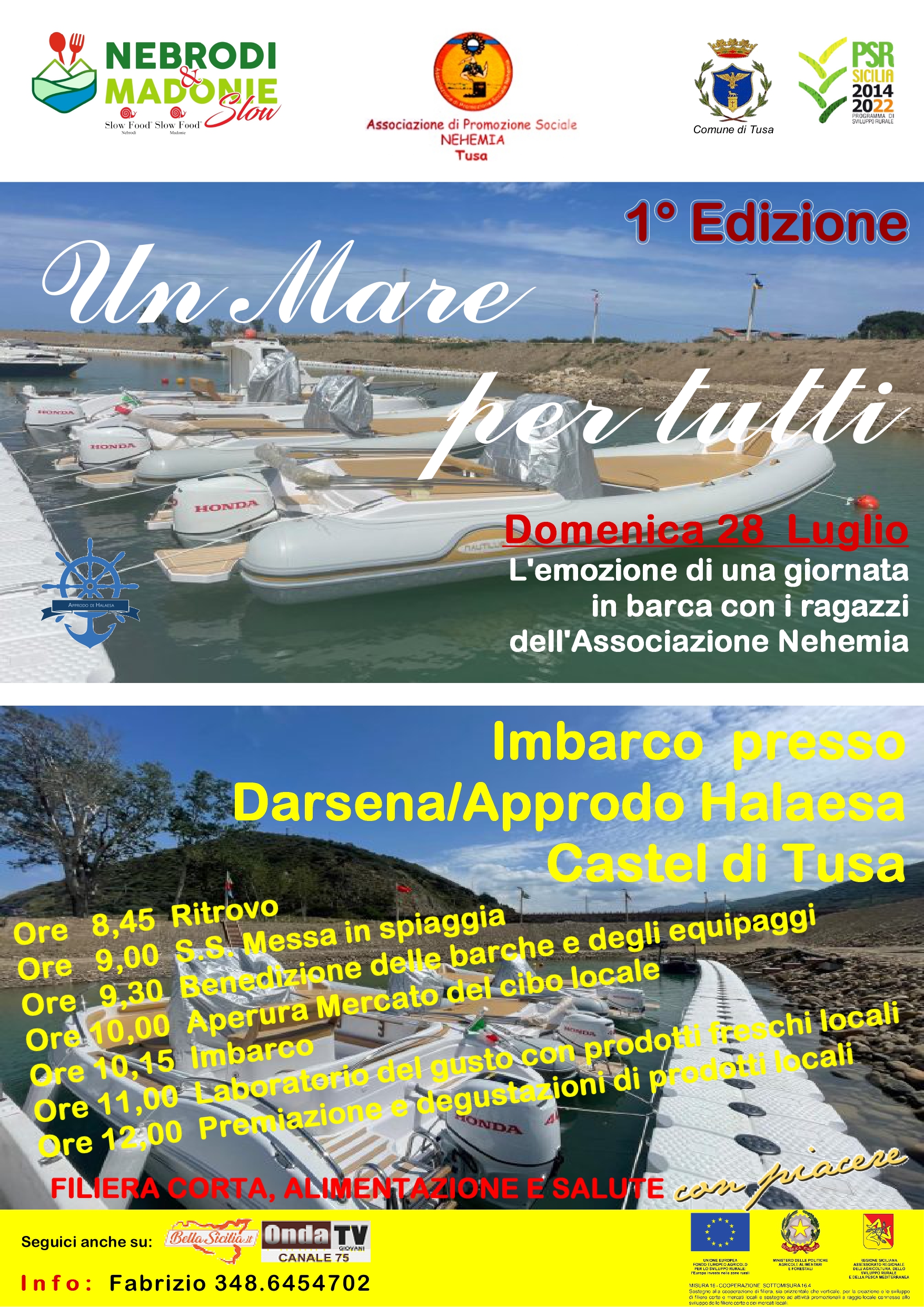 Dalla collaborazione tra il Comune di Tusa, l'Associazione di promozione sociale Nehemia e Nebrodi-Madonie Slow nasce una bella iniziativa rivolta al mondo delle fragilità dal significativo titolo Un mare per tutti. Grazie alle imbarcazioni messe a disposizione dall'Approdo di Halaesa ai ragazzi dell'Associazione Nehemia verrà offerta la possibilità di godere di una magnifica giornata di mare, arricchita da un laboratorio del gusto e da un mercato del cibo locale, che si aprirà con la Santa Messa e si chiuderà con un rinfresco offerto da SlowFood. Il mare, dunque, nella sua immensità accoglierà un gruppo di ragazzi e accompagnatori e verrà vissuto non come un ostacolo ma come un'opportunità da scoprire e godere pienamente.