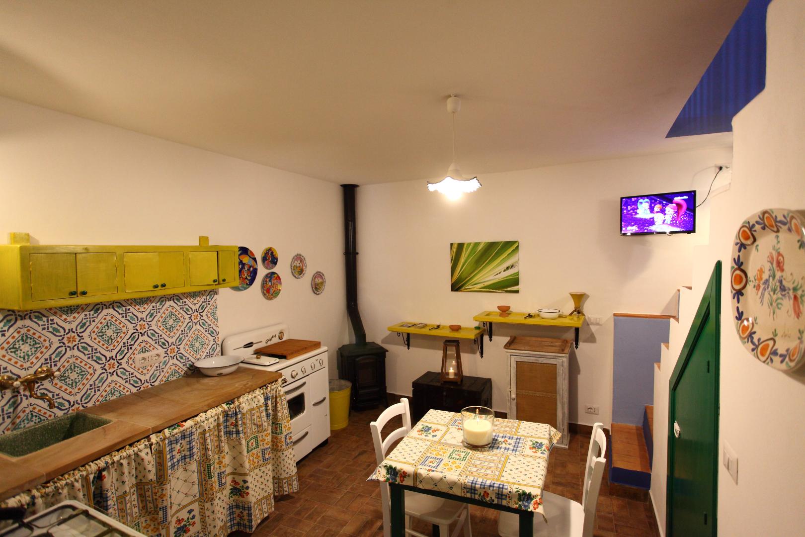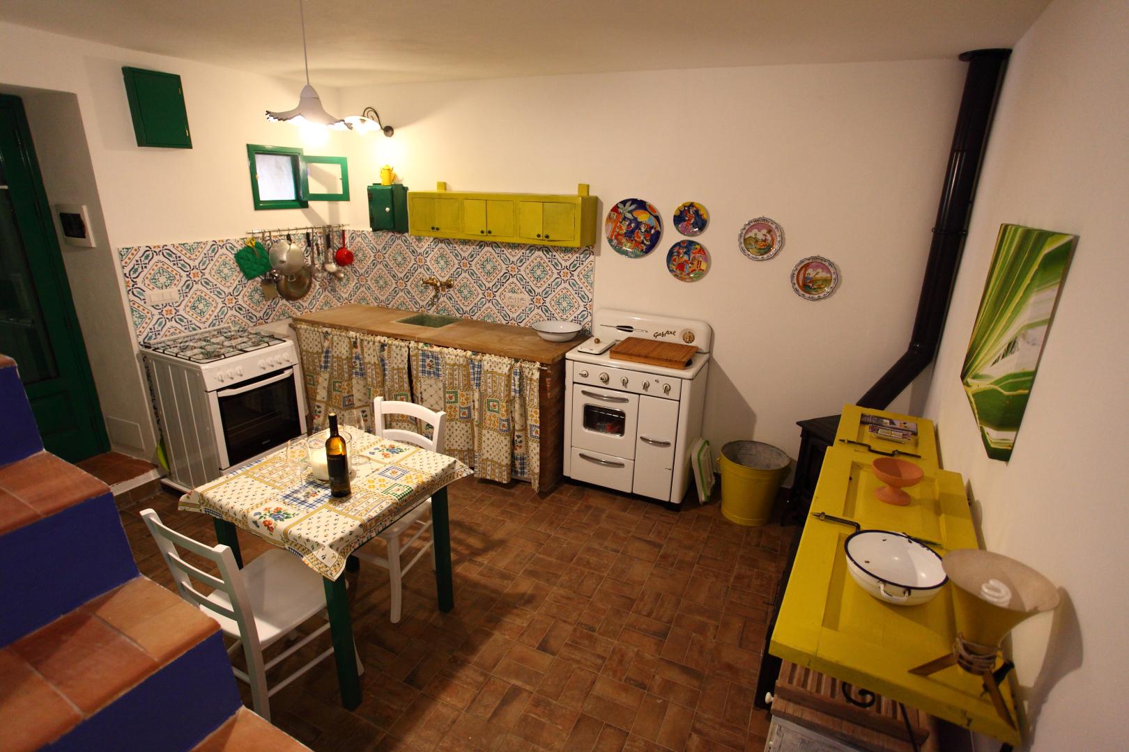 Descrizione dell'Alloggio: La casa è disposta su due livelli, con una cucina completamente attrezzata e un piccolo wc al piano terra. Una scala interna porta al piano superiore dove si trova un'ampia camera da letto con letto matrimoniale, un bagno privato e uno spazio esterno che offre una vista panoramica sul paese e sui dintorni.