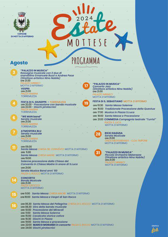 L'estate di Motta d'Affermo e della sua frazione marinara Torremuzza si apre con un programma ricco di eventi e celebrazioni. Il 3 agosto inizia con Palazzo in Musica, con l'esibizione del duo di mandolini Emanuele Buzzi e Andrea Pace presso Palazzo Minneci.