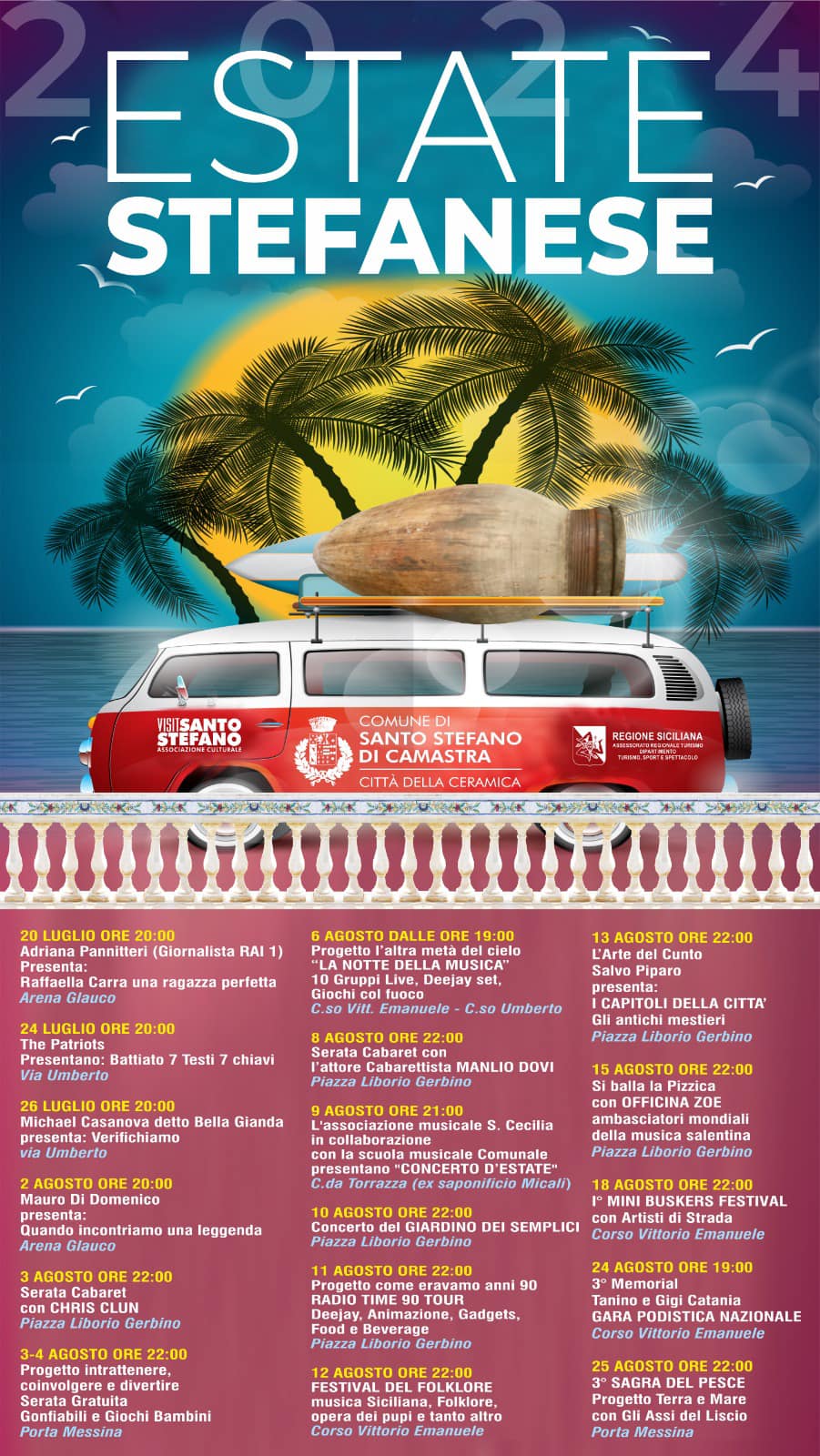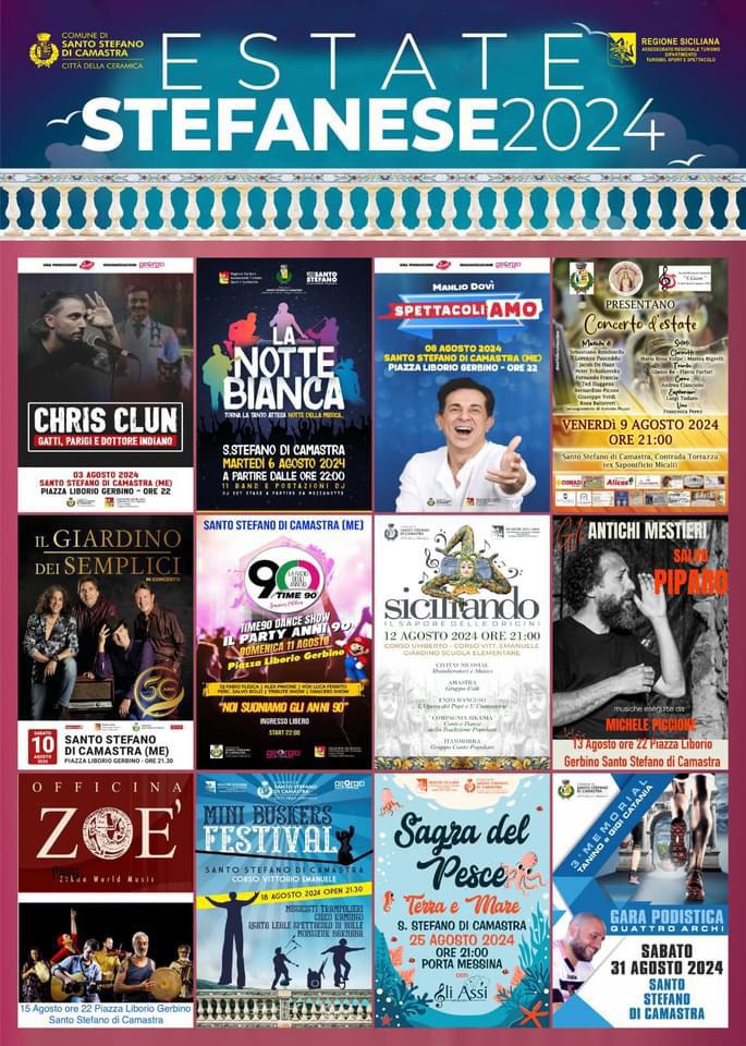 Di seguito potete scaricare il ricco calendario degli eventi che il Comune di Santo Stefano di Camastra organizza per l'estate 2024.