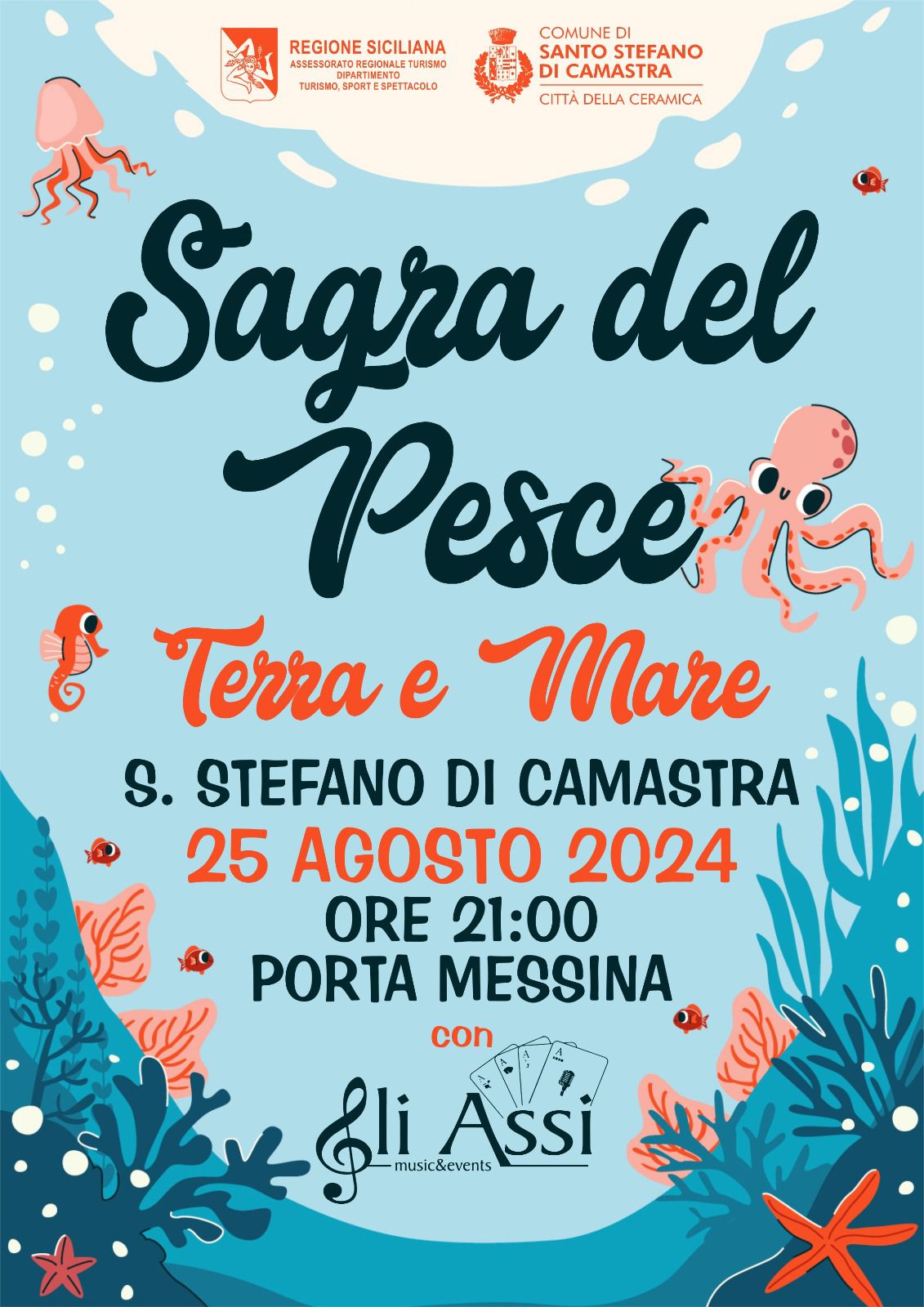 Sagra del Pesce di Santo Stefano di Camastra: una giornata di sapori autentici e festeggiamenti il 25 agosto 2024, con lo spettacolo serale di Gli Assi.